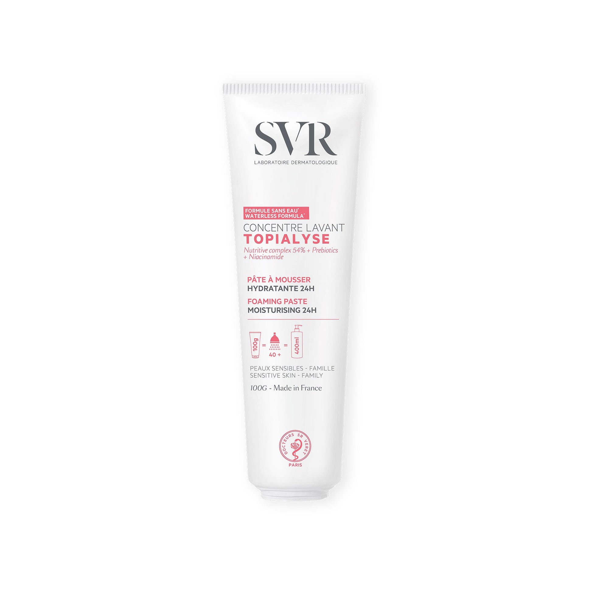 Formulé sans eau4, ce concentré lavant représente l’équivalent d’un gel lavant TOPIALYSE 400ml dans un tube de seulement 100g grâce à sa texture innovante ! Comment ça marche ? Au contact de l’eau, cette pâte se transforme en une mousse qui nettoie délicatement la peau. Parfaite pour un usage quotidien du corps, du visage et de l’hygiène intime. Elle dépose un film pour protéger la peau des effets desséchants de l’eau calcaire. Sa texture onctueuse nourrie et apaise immédiatement la peau et préserve l’hydratation pendant 24h.1